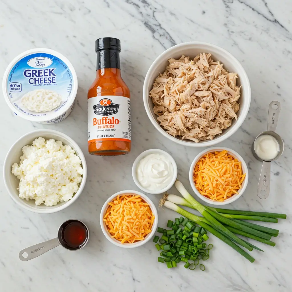 Chicken Breast (2–3 cups cooked, shredded): The foundation of High Protein Buffalo Chicken Dip is lean chicken breast. Aim for organic, free-range options when possible. A rotisserie chicken works wonderfully for convenience, just remove the skin and stick to the white meat. Meal preppers can cook chicken in bulk on Sundays to have a ready supply of protein for this dip and other recipes all week.