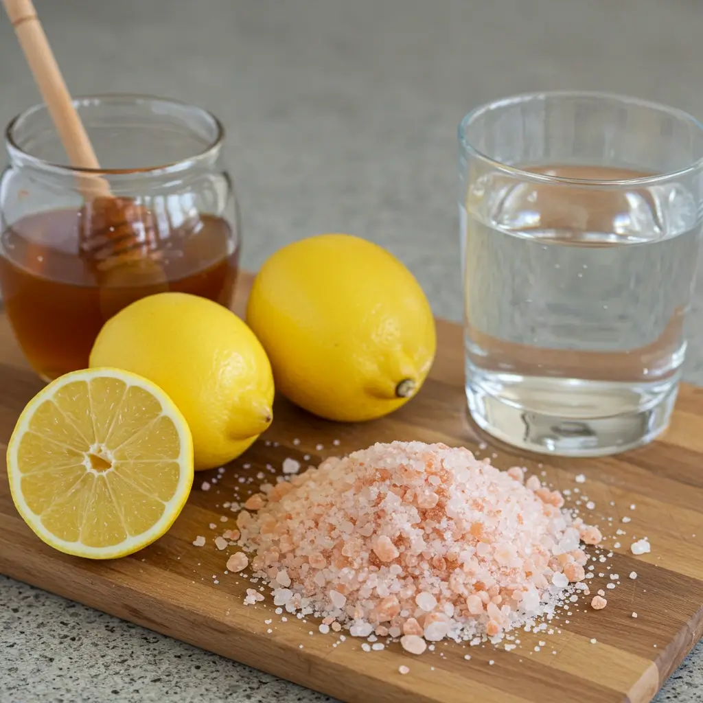You start with high-quality Himalayan pink salt for the base. Choose unrefined versions to keep electrolytes like magnesium intact. Then, grab warm water as your solvent. It dissolves the salt quickly for easy absorption. Next, add fresh lemon juice for a vitamin C boost and tangy flavor. This enhances detox effects naturally. Add raw honey for gentle sweetness without spiking blood sugar. It provides metabolic support too.