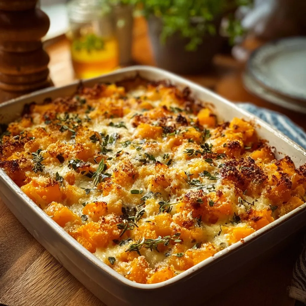 A warm and comforting dish featuring roasted butternut squash, savory seasonings, and a crunchy breadcrumb topping, perfect as a side or main course.