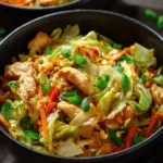 A quick and nutritious chicken and cabbage stir-fry loaded with colorful veggies in a savory sauce, perfect for busy weeknights.