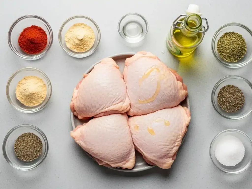 - Prep the Chicken: Bring thighs to room temperature for 15–20 mins. Pat thoroughly dry.