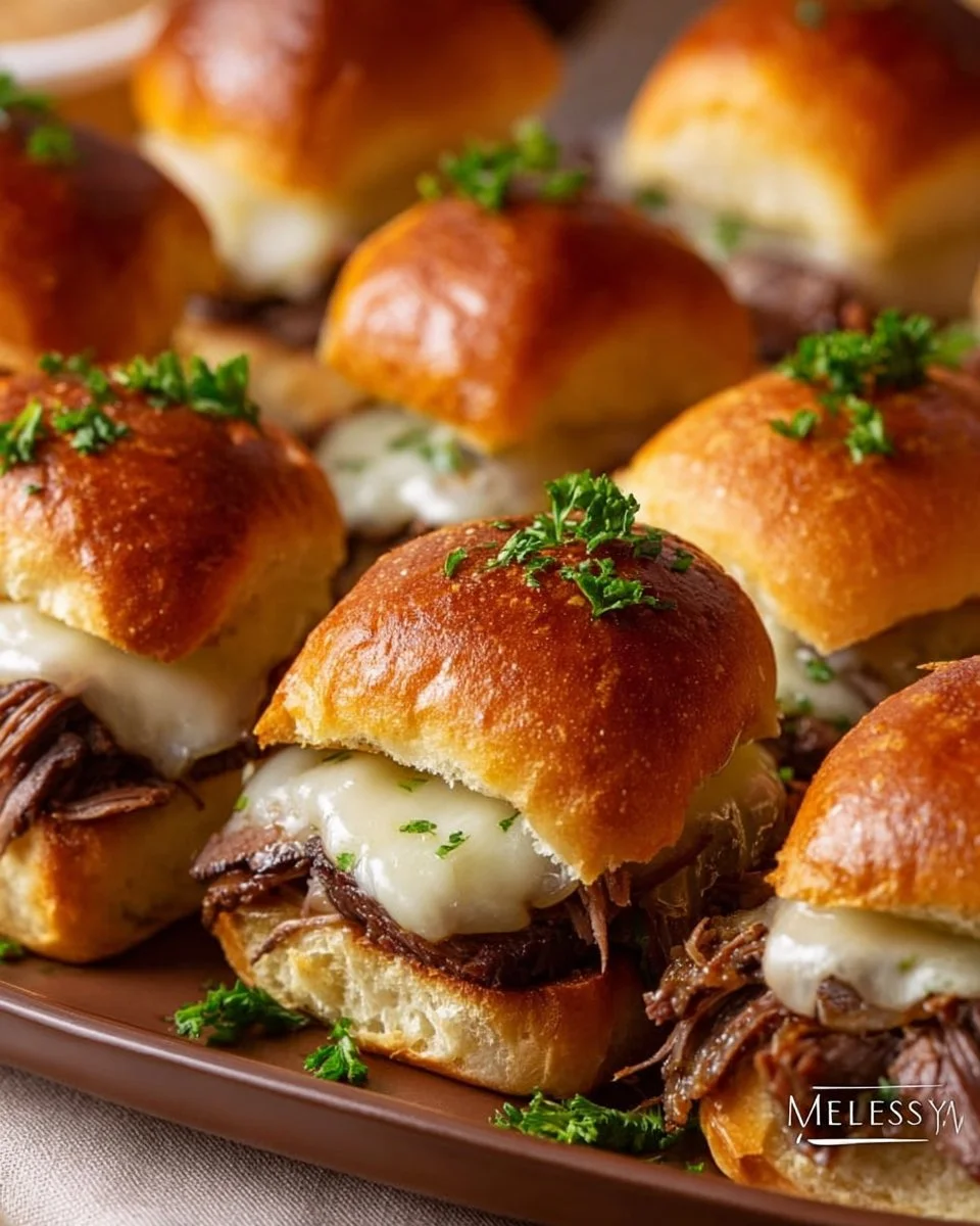 French Dip Sliders give you big flavor in a small package. They work for family meals, parties, and quick comfort food nights. The combination of sweet rolls, melty cheese, caramelized onions, and warm au jus hits savory, sweet, and rich notes. You can make them ahead, vary the toppings, and serve them with sides for any occasion. Follow the steps, keep the au jus warm, and let guests dip and enjoy.