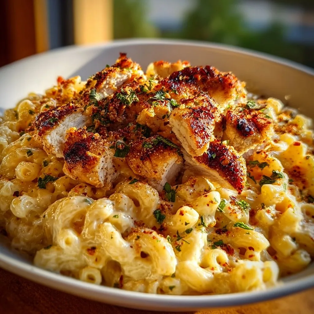 A delightful comfort dish that combines creamy mac and cheese with the sweet and spicy flavor of honey pepper chicken, perfect for family dinners.