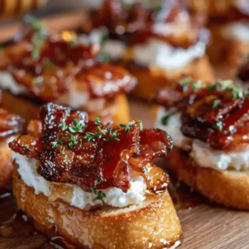 These Million Dollar chicken Crostini combine creamy goat cheese, candied chicken, and a drizzle of honey or maple syrup on crisp toasted baguette slices. A perfect balance of sweet, savory, and spicy flavors makes them a show-stopping appetizer for any occasion.