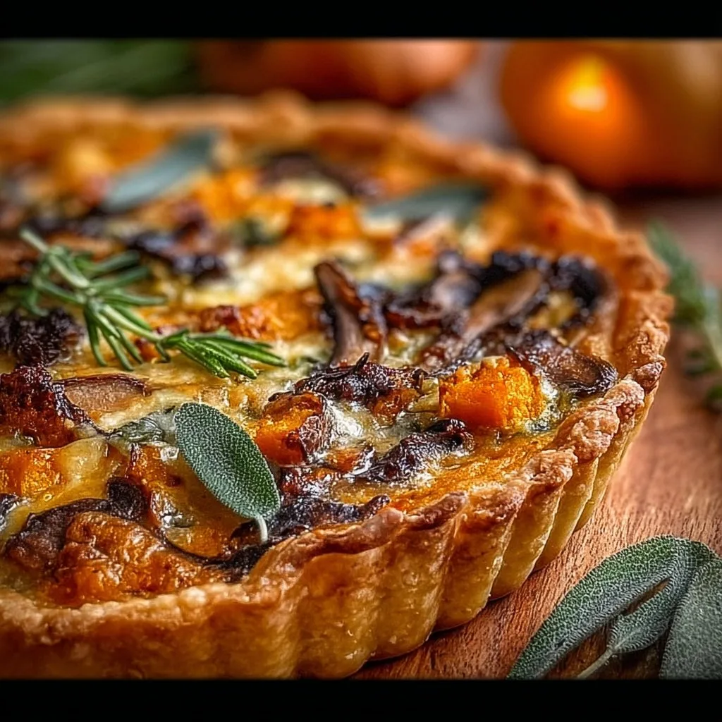 A delightful tart showcasing pumpkin, sage, and mushrooms with a flaky puff pastry crust, perfect for autumn gatherings or family dinners.