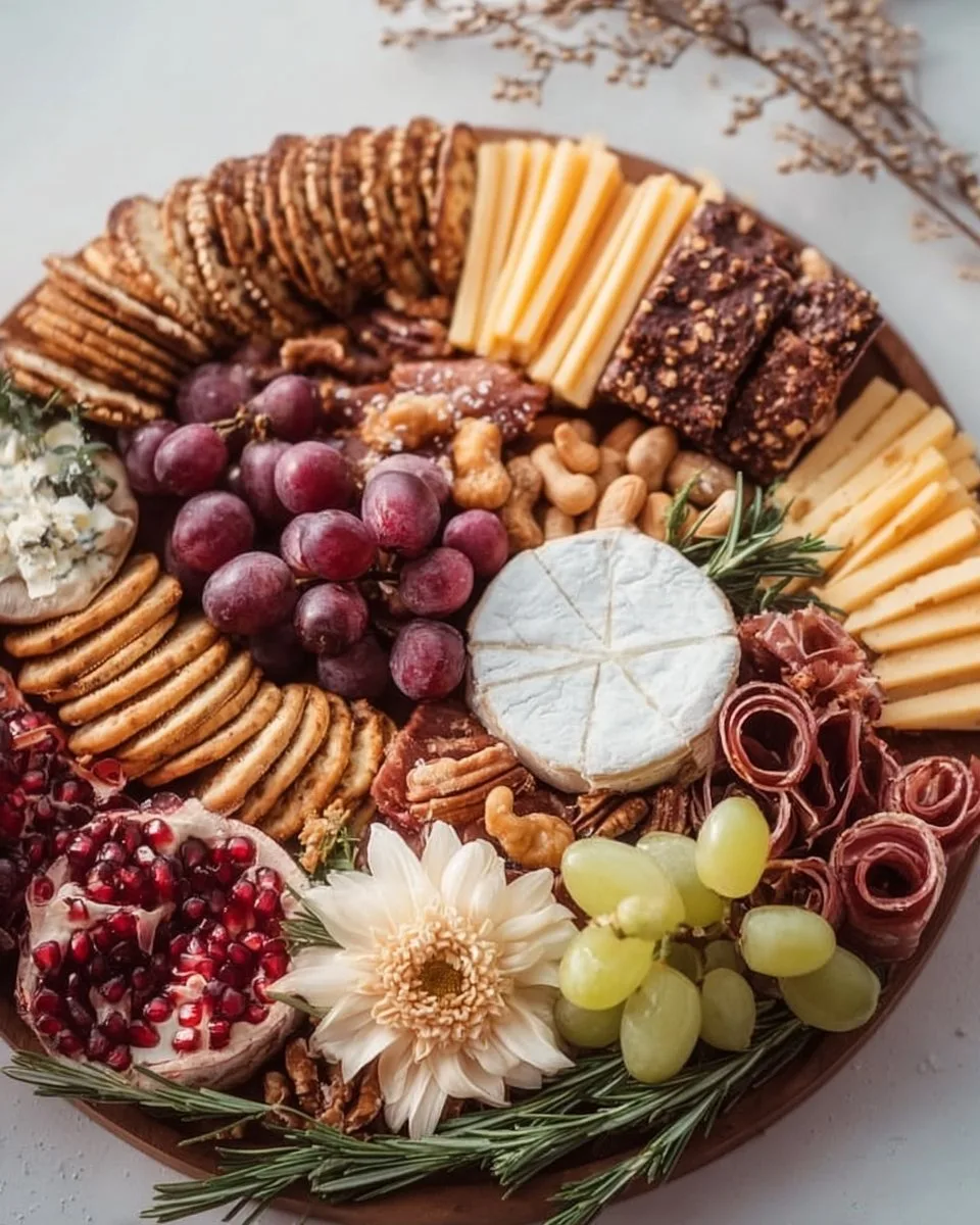5.3 oz Brie cheese, sliced, 5.3 oz aged Cheddar, cubed, 4.2 oz blue cheese, crumbled, 3.5 oz goat cheese, sliced into rounds, 4.2 oz chicken ham, 3.5 oz turkey salami, sliced, 3.5 oz smoked turkey breast, sliced, 1 cup red grapes, washed and halved, 1 cup green grapes, washed, 1 large pomegranate, seeded, 2 pears, sliced, 1 apple, sliced, ½ cup dried cranberries, ½ cup dried apricots, ½ cup roasted almonds, ½ cup candied pecans, ½ cup shelled pistachios, ½ cup marinated olives, 3.5 oz white chocolate bark, broken into pieces, 3.5 oz dark chocolate squares, ½ cup mini meringues, 7 oz assorted crackers, 1 small baguette, sliced, ½ cup breadsticks, Fresh rosemary sprigs, Edible flowers (optional)